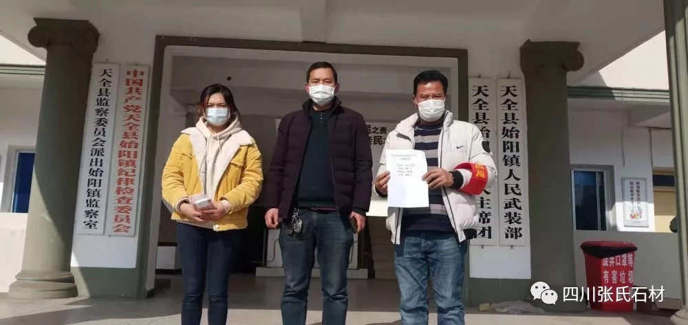 2月9日,张氏石材公司领导为“抗击新型冠状病毒感染的肺炎疫情”发起募捐行动,倡导张氏石材家人携手开展爱心捐赠,呼吁大家,携起手来,积极捐赠疫情防控急需的物品,并获得大家的积极响应。截止2月9日晚9点,张氏家人们已自发捐款一万元。公司捐款共计4万元整,并捐赠疫情所需物品:酒精共计80斤,消毒液40瓶,口罩1000个。分发至芦山县飞仙关镇、天全县始阳镇政府,其中芦山县飞仙关镇具体捐赠物资:酒精40斤,消毒液20瓶,口罩500个,现金25000元。天全县始阳镇:酒精40斤,消毒液20瓶,口罩500个,现金25000元。万众一心,众志成城,共同抗击疫情,以实际行动支持疫情防控工作。