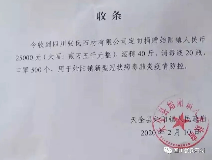 2月9日,张氏石材公司领导为“抗击新型冠状病毒感染的肺炎疫情”发起募捐行动,倡导张氏石材家人携手开展爱心捐赠,呼吁大家,携起手来,积极捐赠疫情防控急需的物品,并获得大家的积极响应。截止2月9日晚9点,张氏家人们已自发捐款一万元。公司捐款共计4万元整,并捐赠疫情所需物品:酒精共计80斤,消毒液40瓶,口罩1000个。分发至芦山县飞仙关镇、天全县始阳镇政府,其中芦山县飞仙关镇具体捐赠物资:酒精40斤,消毒液20瓶,口罩500个,现金25000元。天全县始阳镇:酒精40斤,消毒液20瓶,口罩500个,现金25000元。万众一心,众志成城,共同抗击疫情,以实际行动支持疫情防控工作。